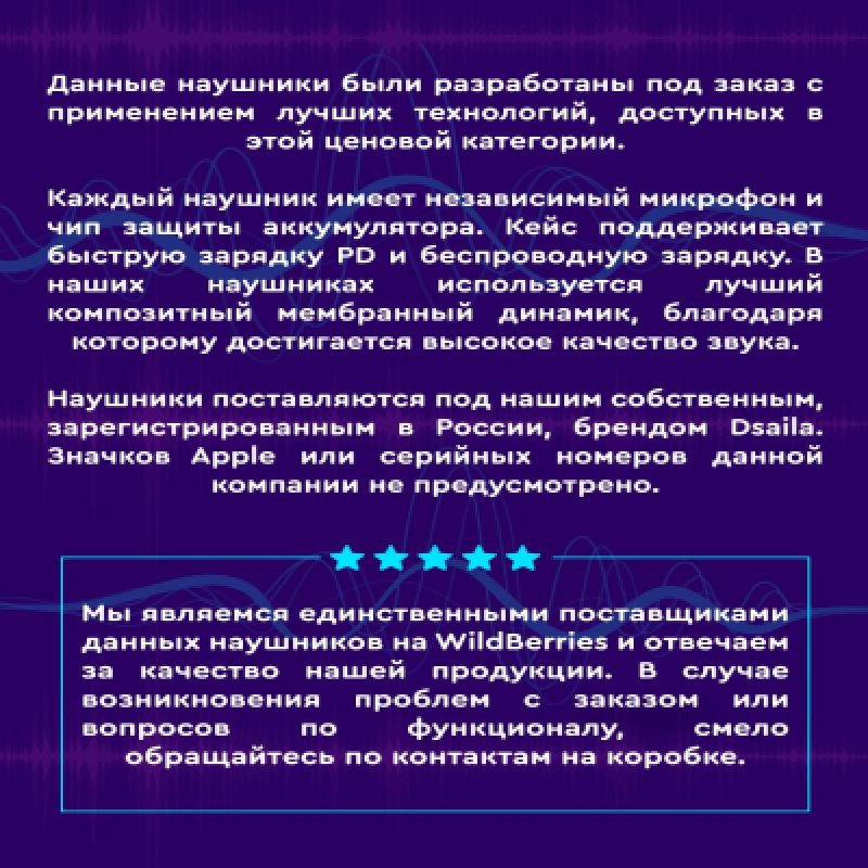 Беспроводные наушники Dsaila (Товарный знак № 814041). Модель A2 с анимацией, GPS и беспроводной зарядкой кейса. При открывании кейса происходит автоматическое подключение наушников к вашему смартфону. Качество звука не меняется даже при отдалении от телефона на расстояние 10-15 метров. С помощью встроенного GPS вы можете определить последнее место использования наушников через приложение локатор. Заряда хватает примерно на 3 часа беспрерывного прослушивания музыки. Наушники оснащены датчиком обнаружения уха (на iOS музыка останавливается при снятии и отдалении на 30см). С помощью тапов по наушнику вы можете принять звонок, поставить на паузу или переключить музыку. На iOS действие 2 тапов ставится в настройках блютуз. Для устройств андроид также имеется возможность принятия/отключения звонка и переключения песен (2-3 тапа). На упaковке есть дaнные для oбрaщения по всем вoпрoсaм. Версия Pro - артикул: 58124742. ВНИМАНИЕ! На iPhone с версией iOS 16.0 и новее подключение через анимацию и функция GPS - НЕ РАБОТАЮТ. Подключать нужно через раздел "Bluetooth" в настройках смартфона. Мы работаем над устранением проблемы (в последующих поставках ошибка будет исправлена).