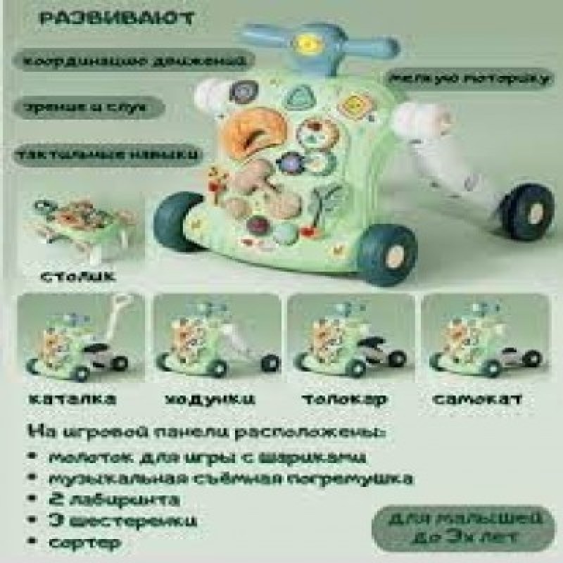 Многофункциональный игровой центр ходунки 6 в 1 - мечта не только малышей, но и родителей. Ходунки детские - каталка с бизибордом для малышей, которые только встают на ноги и делают первые шаги, станут надежной опорой и незаменимым помощником. Бизиборд развивающий трансформируется в столик детский. Ходунки детские имеют прорезиненные колеса и удобные нескользящие ручки, которые регулируются по высоте. Развивающий игровой центр легко снимается с основания и с помощью специальных креплений может устанавливаться на бортик кроватки или трансформироваться в игровой столик. Бортики с надежным креплением защитят ребенка от падения. Есть специальный резервуар, который заполняется водой для увеличения баланса и стабильности ходунков. Регулирующийся руль удобной формы позволяет установить высоту под рост ребенка. Ходунки оснащены блокиратором движения. У них универсальный размер, подходящий детям в возрасте от одного года. Ходунки легко трансформируются в самокат, который отлично тренирует равновесие и координацию. При помощи сиденья с комфортной сидушкой самокат в свою очередь превращается в пушкар для веселого времяпровождения. Эти многофункциональные ходунки - современное удобное решение для всех родителей, которые заботятся о том, чтобы их маленькие дети приобретали новые навыки и с интересом познавали окружающий мир. Ходунки и функцией блокировки станут практичной опорой для вашего мальчика или девочки во время ходьбы. Это целый игровой центр. Когда ребенок немного подрастет, ходунки можно переделать в самокат и пушкар для катания.