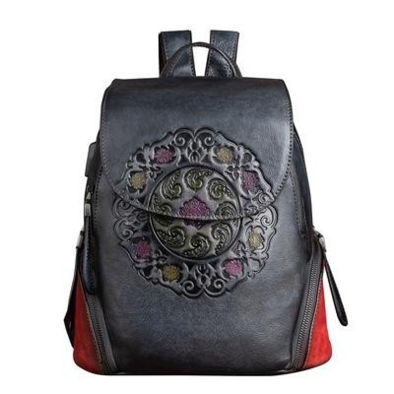 Ретро Тотем Подлинная кожа Рюкзак Женщины Сумка Зима Ручная работа Тиснение Цветочный Сумка Большой