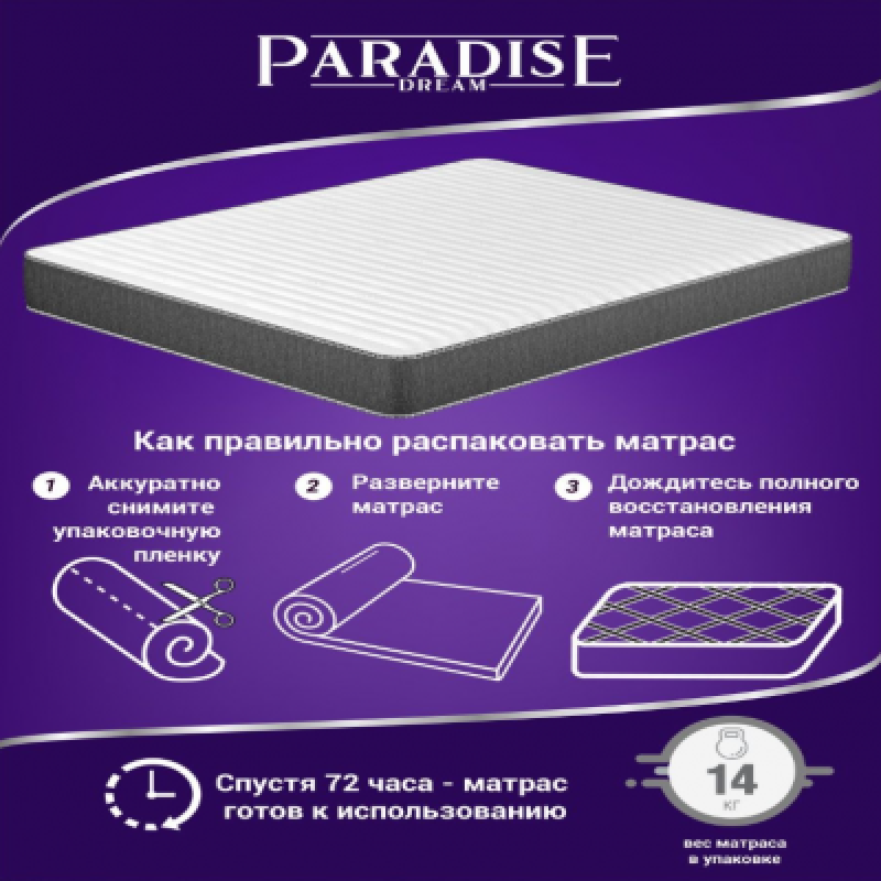| Комплектация | размеры 180x200 160x200 140x200 120x200 90x200 80x200; матрас ортопедический двусторонний с эффектом памяти беспружинный в скрутке |